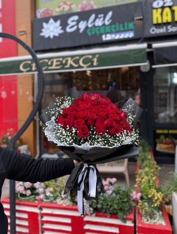 Her biri özenle seçilmiş 51 adet taze kırmızı gül, asil siyah ambalaj kağıdı içinde sunulur. Güllerin ateşli rengi, siyahın modern ve sofistike duruşuyla birleşerek göz alıcı bir kontrast yaratır. Buketin etrafını bir kar tanesi bulutu gibi saran narin cipsofilyalar (gelin çiçeği), bu tutkulu aranjmana masum bir dokunuş katarken, siyah ve beyaz kurdeleler tasarıma şık bir final yapar.