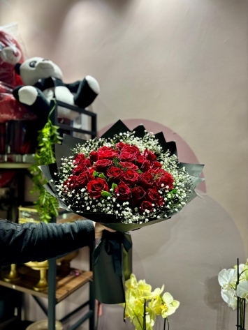 Bu lüks gül buketi, her aşamasında titiz bir el işçiliği barındırır. En kaliteli ve en taze kırmızı güller, kadife dokularını ve canlı renklerini sergileyecek şekilde özenle seçilir. Usta tasarımcılarımız tarafından her bir gül, buketteki mükemmel yerini alır. Güllerin ateşli kırmızısı, etrafını bir yıldız bulutu gibi saran narin cipsofilyalar (gelin çiçeği) ile dengelenir. Bu iki çiçeğin dansı, asil ve modern siyah ambalaj kağıdı üzerinde hayat bulur ve bu romantik buket’e dramatik bir güzellik katar.