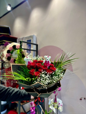 Eylül Çiçekçilik atölyesinde tutulan, kırmızı güller, cipsofilya ve içinde iki adet beyaz peluş ayıcık bulunan, siyah kağıda sarılı, usta işi romantik hediye seti buketi.
