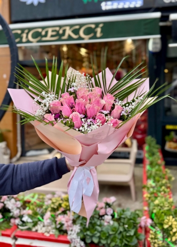 Bu özel buket, yaklaşık 25-30 adet taze ve canlı pembe gülden oluşmaktadır. Pembe güller, çiçek dilinde zarafet, nezaket, hayranlık ve içten sevgiyi temsil eder. Bu buket, sadece bir hediye değil, aynı zamanda derin duyguların ve zarif bir jestin ifadesidir. Egzotik yeşil yapraklar, bukete modern ve sofistike bir hava katarken, beyaz cipso çiçekleri aranjmana hafiflik ve masumiyet ekler.