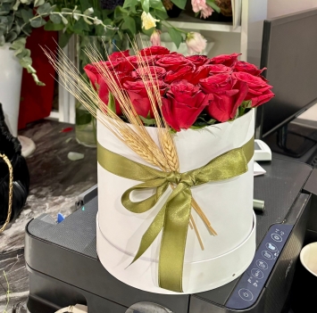 Bu özel tasarım, Eylül Çiçekçilik’in ustalığını her detayında sergiler. Saf beyaz bir kutu içerisinde özenle dizilmiş, kadife dokulu parlak kırmızı güller, ilk bakışta tüm dikkatleri üzerine çeker. Aranjmanın modern ve sofistike karakterini ise, güllerin arasından zarifçe yükselen altın sarısı kuru buğday başakları tamamlar. Buğday başakları, tasarıma sadece rustik bir sıcaklık katmakla kalmaz, aynı zamanda bolluk ve bereket dileklerinizi de en şık şekilde iletir. Kutunun etrafını saran zeytin yeşili saten kurdele, bu eşsiz kompozisyonu mühürleyerek hediyenize son dokunuşu yapar.