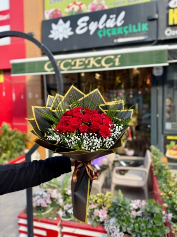 Eylül Çiçekçilik mağazası önünde tutulan, 13 adet kırmızı gülden oluşan, siyah ve altın yaldızlı kağıda sarılı, cipsofilya ve yeşil yapraklarla süslenmiş, usta işi zarif çiçek buketi.