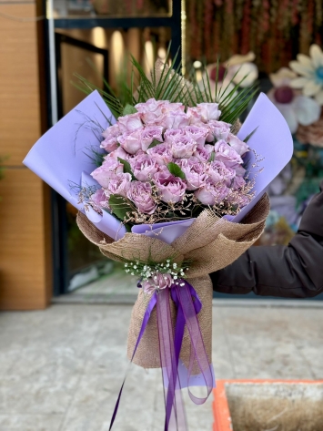 Bu eşsiz buket, her detayıyla estetik bir şölen sunar. Onlarca taptaze lila-mor gül, buketin kalbini oluştururken, onlara eşlik eden doğal jüt kumaş, tasarıma sıcak ve rustik bir hava katar. İç katmandaki pastel lila rengi ambalaj, güllerle mükemmel bir renk uyumu yakalarken, buketin arkasından uzanan palmiye yaprakları modern bir dokunuş ekler. Buketi tamamlayan kat kat mor kurdeleler ise bu sofistike tasarımın son imzasıdır.