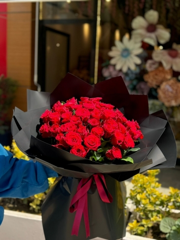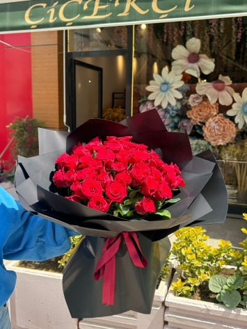 Bu etkileyici buket, 51 adet birinci kalite kırmızı gülün, asil siyah ambalaj kağıdıyla sarılmasıyla oluşturulmuştur. Güllerin canlı kırmızısı ile ambalajın mat siyahı arasındaki kontrast, tasarıma modern ve sofistike bir hava katar. Bu, sevginizi en şık ve unutulmaz şekilde ifade etmenizi sağlar.