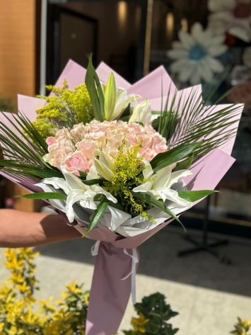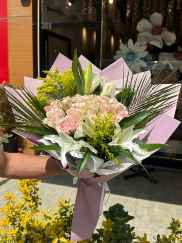 Nezaketin rengi pembe güller ile masumiyetin simgesi beyaz lilyumların bir araya geldiği bu özel tasarım, en narin duygularınızın tercümanı olmak için hazırlandı. Pastel tonların enerjik sarı dokunuşlarla buluştuğu bu buket, sevdiklerinize olan hayranlığınızı ve içten dileklerinizi sunmanın en zarif yoludur.