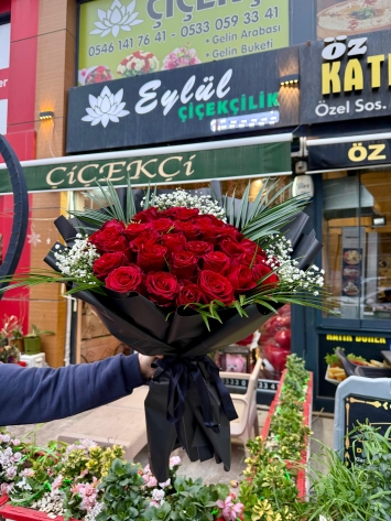 Sıradan bir çiçek buketinin ötesinde, bu aranjman adeta bir sanat eseri niteliğindedir. Canlı ve kadifemsi dokuya sahip kırmızı güller, siyahın asil matlığıyla buluşan özel tasarım ambalajımızla birleşerek modern ve sofistike bir estetik sunar. Buketin etrafını nazikçe saran bembeyaz cipsolar ve taze yeşil garnitürler, kırmızı güllerin çarpıcı güzelliğini vurgulayarak göz alıcı bir kontrast yaratır. Bu buket, sadece bir hediye değil, aynı zamanda alıcısına verdiğiniz değeri ve özeni yansıtan bir ifadedir.