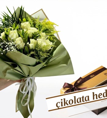 15 li Beyaz Gül Buketi & Çikolata İkramlı Hediye