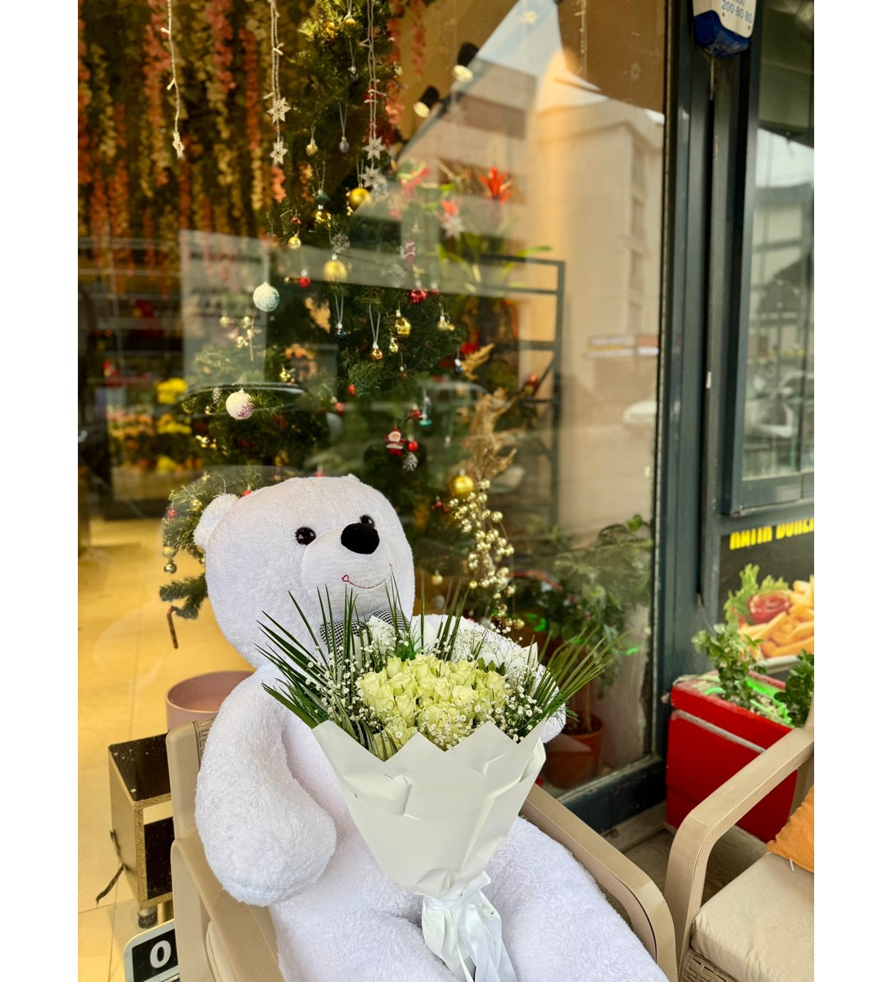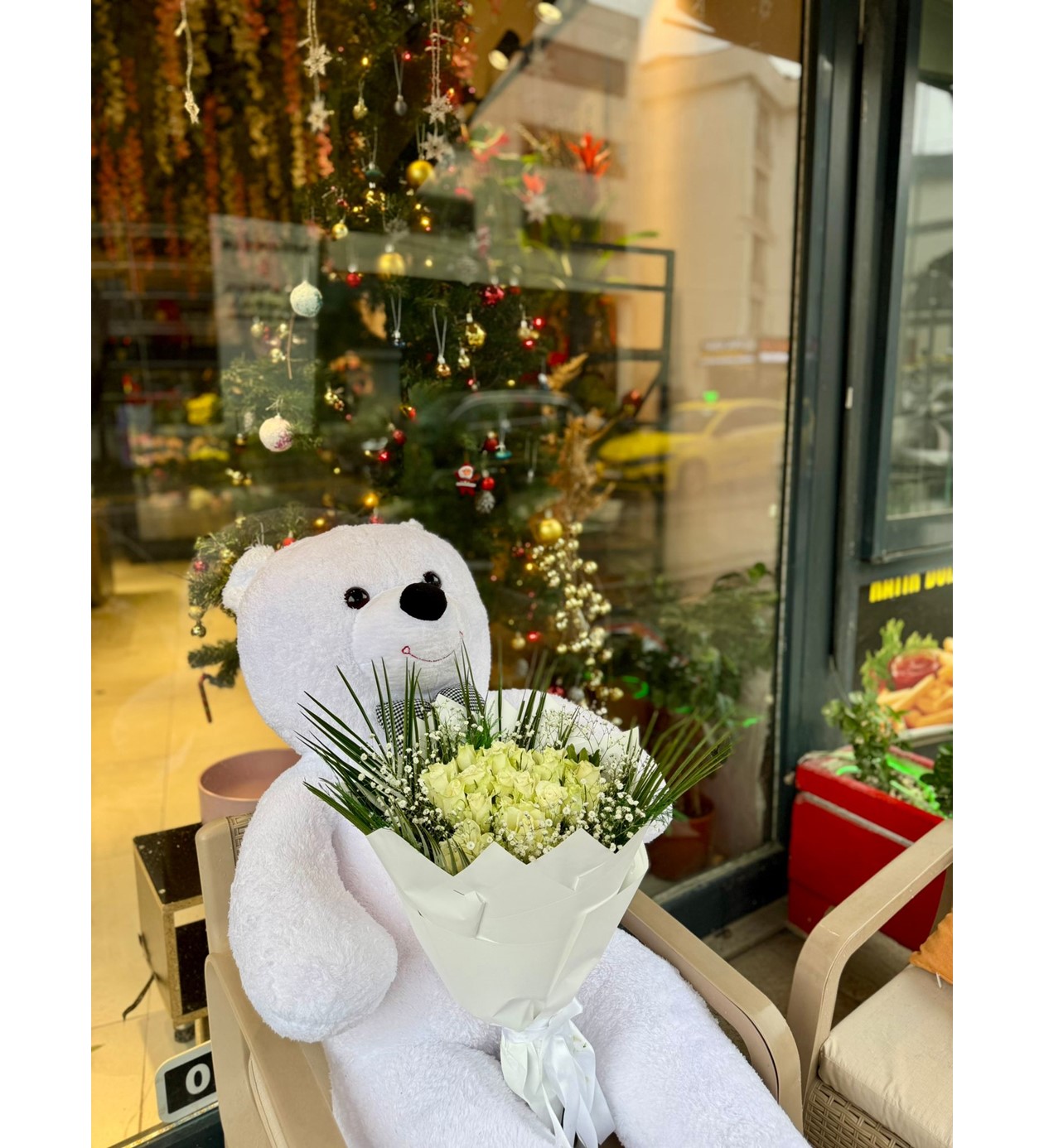 Beyaz Gül Buketi ve Sevimli Peluş Ayı Seti