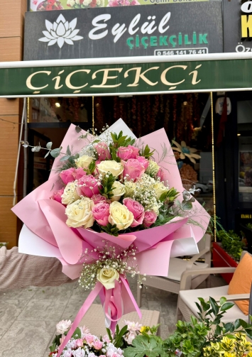 Eylül Çiçekçilik mağazası önünde tutulan, pembe ve beyaz güllerden oluşan, cipsofilya ve okaliptüs yapraklarıyla süslenmiş, pembe kağıda sarılı, usta işi zarif ve tatlı çiçek buketi.